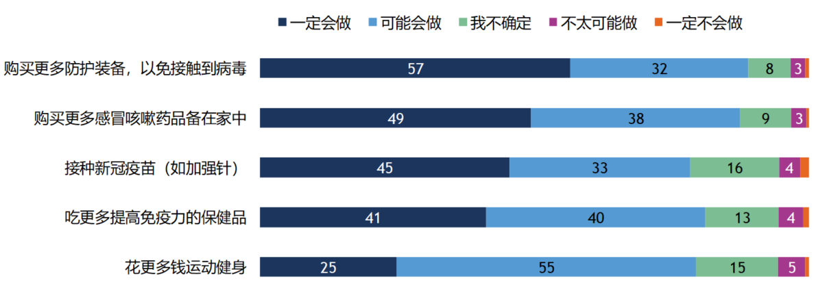 在未来的3个月里,消费者会对自己和家人进行全方位的健康保护。首先会通过使用防护装备尽可能避免接触到病毒,同时也会通过接种疫苗以及吃保健品来提升自己在接触到病毒后的免疫能力,除此之外,对于可能出现的感染症状,消费者也会通过囤药来做好提前准备。这些变化反映出短期来看,消费者对新冠疫情的担忧程度正处于高位,需要且愿意为任何能给他们带来健康安全感的产品消费。