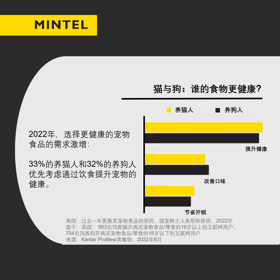 英敏特调研显示,2022年大约有三分之一的美国消费者在更换宠物食品时考虑到了提升宠物的健康,要比将口味或价格作为更换原因的消费者要多出约六分之一,其中养猫人在这方面稍稍领先于养狗人。