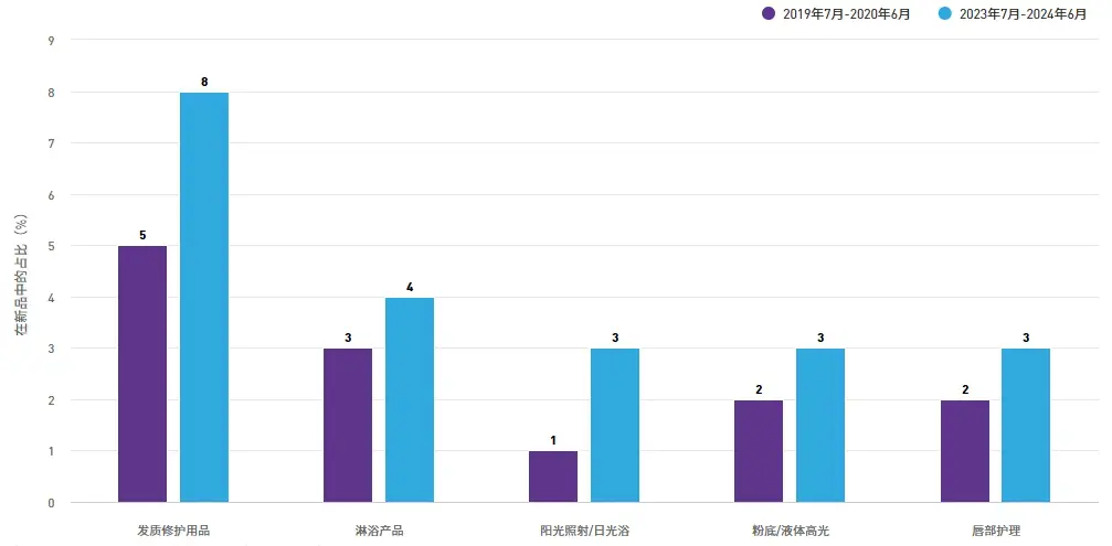 全球:带有大米宣称的美容个护新品占比(按子品类区分),2019-2024