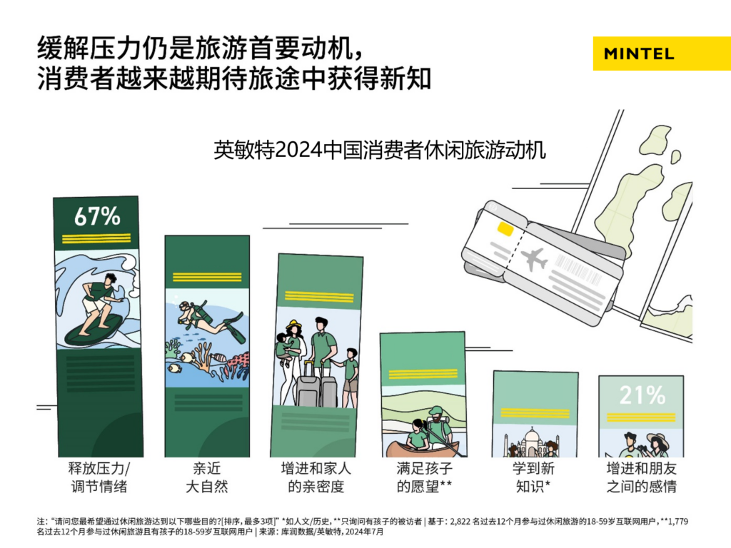 洞悉消费者需求、解读深层原因,全球领先的独立市场研究咨询公司英敏特于近日发布《2024中国旅游度假趋势》报告,全方面研究了中国消费者们的旅游计划、旅游形式、旅游动机、旅游偏好、旅游产品购买渠道及认知等,并以此详细解读了国内旅游与境外旅游的市场现状,助力旅游行业积极调整新一年的策略,在竞争激烈的市场中抓住消费者的目光。